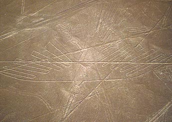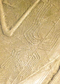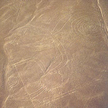 | ナスカの地上絵は20世紀に入り、偶然この上空を飛んでいたパイロットが発見しました。 その地上絵はナスカ文明が栄えた紀元100〜600年頃に画かれたと言う説が有力で、およそ30数個画かれています。有名なものでは「サル・ハチドリ・コンドル・宇宙人・イヌ・花・クジラ・クモ・トカゲ・木」などがあり、大きなものでは一辺が300メートルということで、地上からでは見ることができません。 この地方は雨がまったく降らないため、ただ砂漠の小石を取り除いただけの地上絵が現在まで残ったのは「自然の奇跡」とまで言われています。 何故、このような地上絵が地表に画かれたのか? 種蒔きや祭事の日にちを知る説、天文学説、占星術説、宇宙船着陸の目印、など数々の説がありますがいまだに謎が多く真相は解明されていません。 ナスカの地上絵は50年以上もこの地に住み、地上絵の研究に一生を捧げたドイツ人「マリア・ライヘ女史」により世界的に広められました。 |