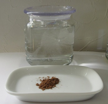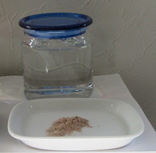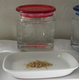 瓶に400mlの水。皿には各社の紫イぺエキス0.5グラム