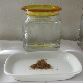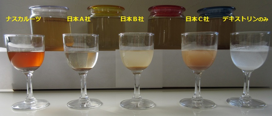 日本C社 ほぼ水に溶けているが 底面真ん中にごく僅かに 沈殿物あり。 熱水抽出・エタノール抽出=微妙 |