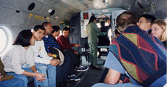 スチュワーデス?(ヘリコプターの女性の乗務員はどう呼ぶのか知らないので) のマイク案内がはじまり、エンジン音がウナル。 フワー、フワー、少しづつ上昇して行く。(なんか気持ち悪いなー) ある程度、上昇したようで今度は前進しながらスピードが上がって行く。 5分か10分位した頃、スチュワーデスの放送があり、どうやらコックピットを 見たい人は前へ来て下さいと、言っているようだ。皆、交代で見に行く。写真もOKですよ。 案内放送が続き、スチュワーデスがバスガイドさんのように「左手に見えますのが私の左手です」ってなことは言わないで、