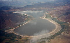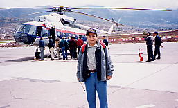左手に見えますのが「高度ウン千メートルにある何々湖です」 と言っているようだ。(勝手に訳す?) 少しして山々が見えてきた、その山の谷間を左に右に傾きながら、ジグザグに飛んで行く。(私)何でこんな飛び方するねん?危ないなー! もうちょっと上を飛んだら山の上やろ。 そしたら真っ直ぐ飛べるやん。なぁーOさん。(Oさんは面白がってるー!変な奴) だんだん、高度が下がっていき、山の崖スレスレ(数メートル)に垂直に降りて行く。 さっきまで騒いでいた乗客もシーン。 フワー、フワー、フワー、着陸。 おー、もう大丈夫!(もう乗りたくないわ、ほんまに!) |